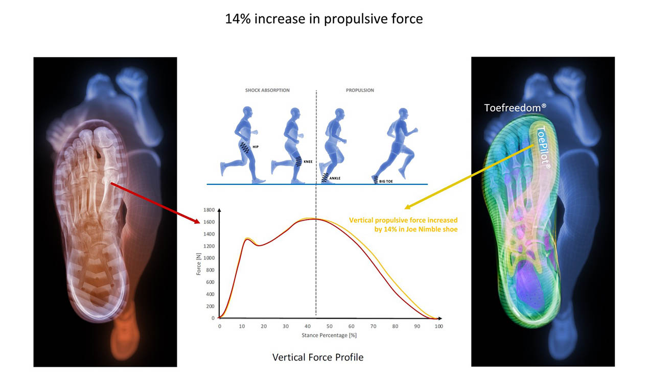 The extent to which the new Addict Pro-R increases running efficiency is demonstrated by a pilot study we commissioned in the autumn of 2023 at the Progressive Sports Technologies Institute in Loughborough, England. In the test, subjects ran in two pairs of running shoes one after the other at the same speed: a conventional lightweight running shoe with speed-enhancing technology and the Addict Pro-R. Additionally, all subjects had – like two-thirds of all runners worldwide – a Hallux angle of -8° or more (Runner's Hallux).