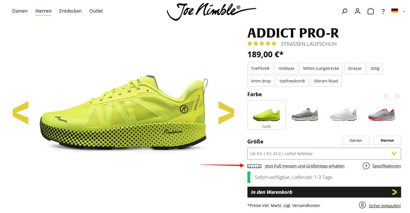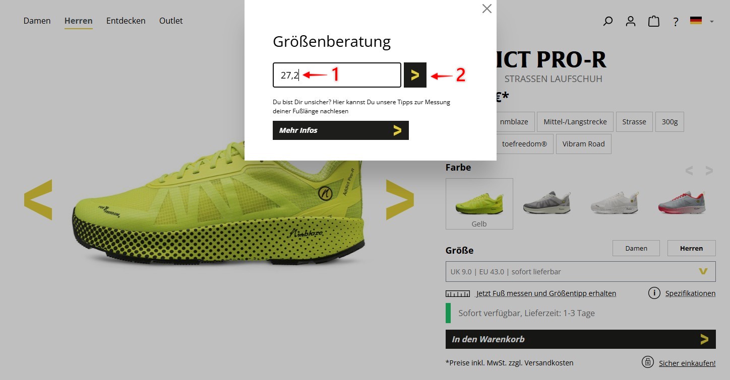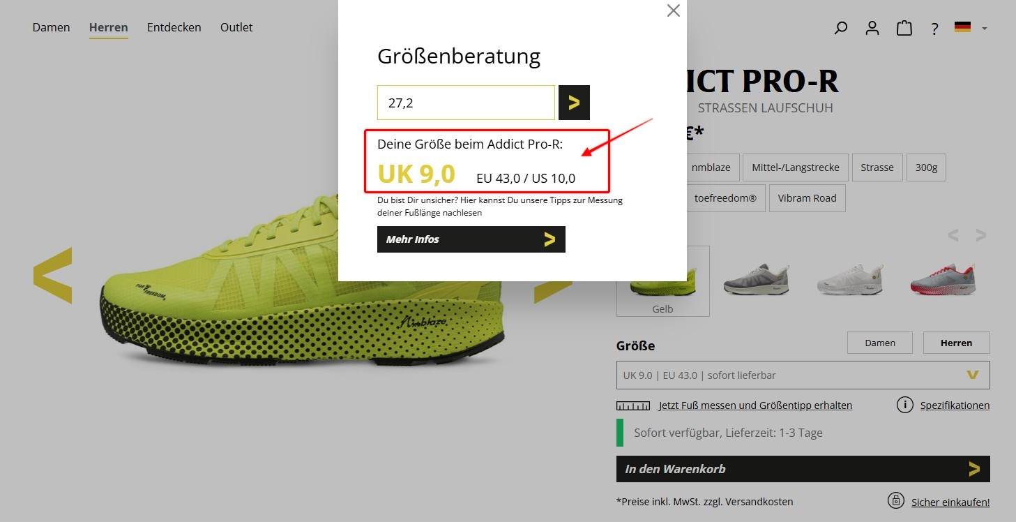 - Go to the running shoe, there you will find the size advisor under the size selection